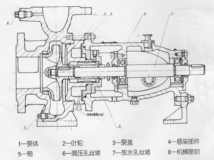 軸封形式采用不平衡單端面機(jī)械密封,軸封室外設(shè)有水冷卻套,可以通過泵側(cè)面1/4管接口接通外來(lái)冷水,對(duì)軸封進(jìn)行冷卻。